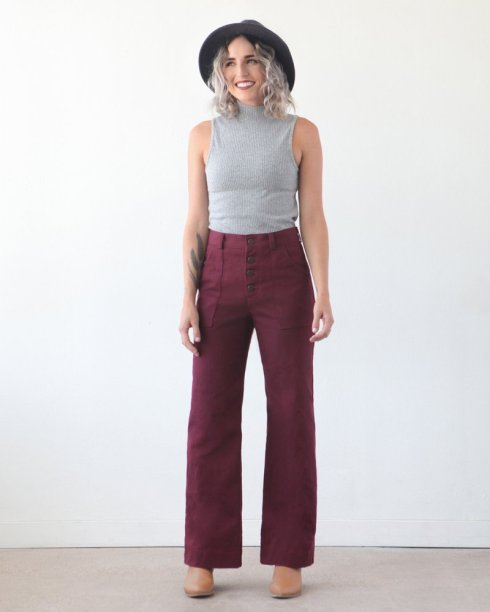 The official sewing pattern, the Lander Pants, is already a beloved darling in the sewing community, and for good reason! The pattern features a super high waist, button fly (or optional zipper fly if you hate buttons!), and generous patch pockets on both front & back. The legs have a wide, straight fit, and three length options – full length, ankle length, or shorts.
