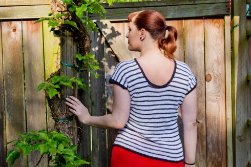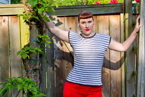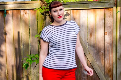The official knitting pattern, Waters, is one I’m really excited about! Light and easy, uncomplicated and fuss-free, this linen pullover is the perfect garment to ease you toward the hot months of summer (or layer into the early cool months if you’re in another hemisphere!). The retro-style top features a high front neckline with a deep scooped back, classic skinny stripes (which can easily be customized if you prefer a different stripe option), and loads of relaxing stockinette. The pullover is knit seamlessly from the top down (editor’s note: upon proofreading, I originally had this written as “top dog” lolwut ok carry on), so there are very few purl stitches and even less seaming (aka: no seaming. Yay!). The yarn is Quince + Co Sparrow, which is a fingering weight linen yarn, and the fit should have 0-3 inches of positive ease – making this top super comfortable and cool to wear in the heat of summer.